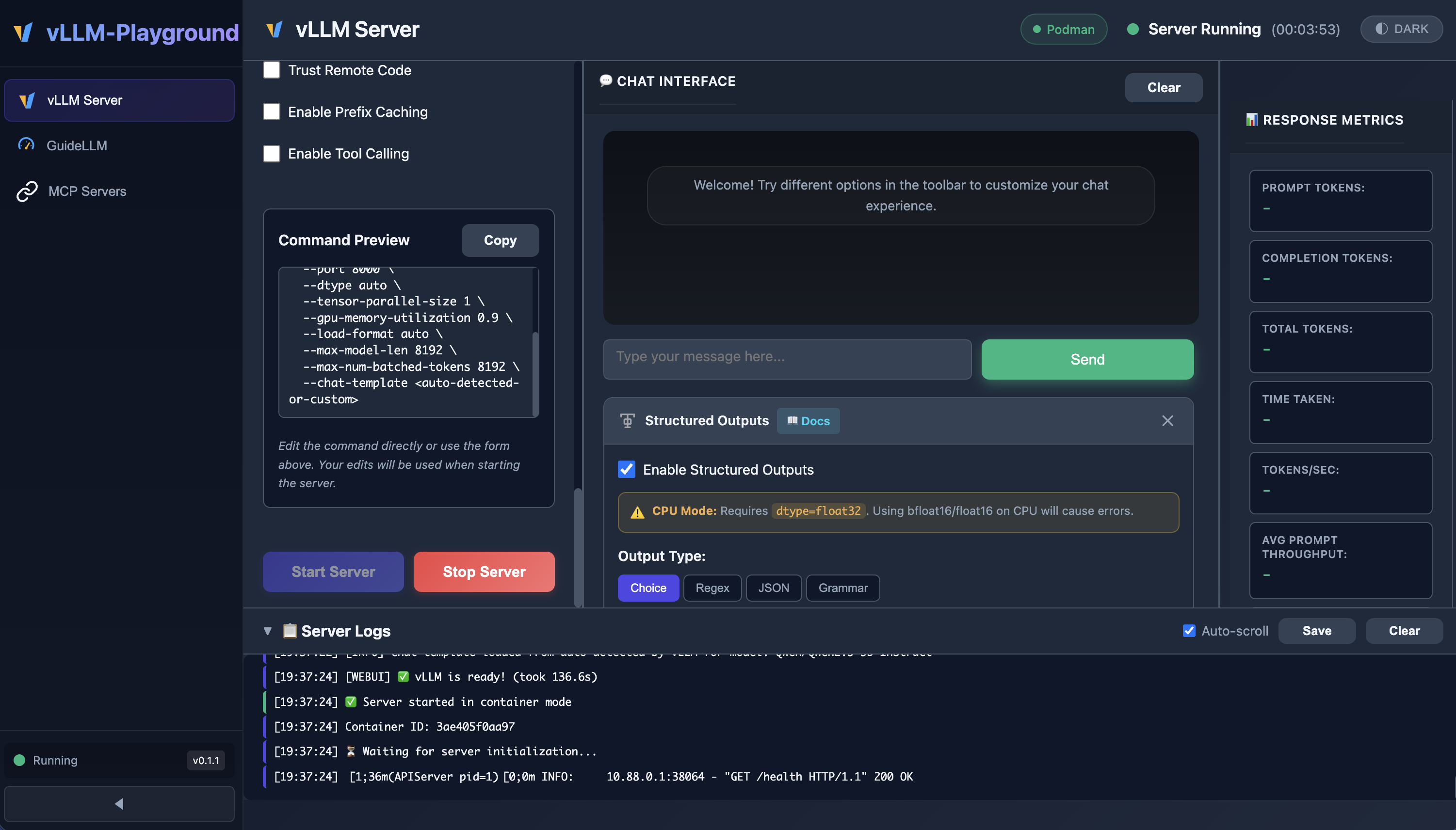 ACME's engineering team requires predictable, structured outputs that downstream systems can reliably consume. vLLM Playground's structured output capabilities — JSON Schema, Regex, and Grammar — provide exactly this control.