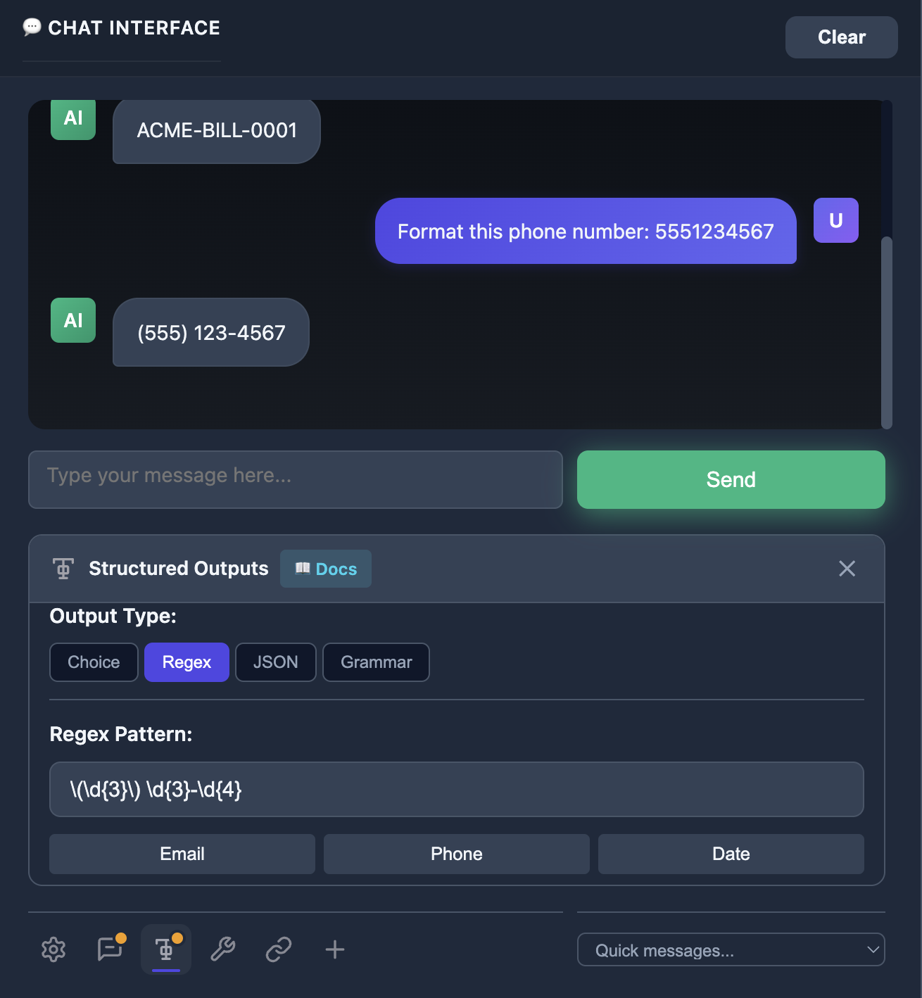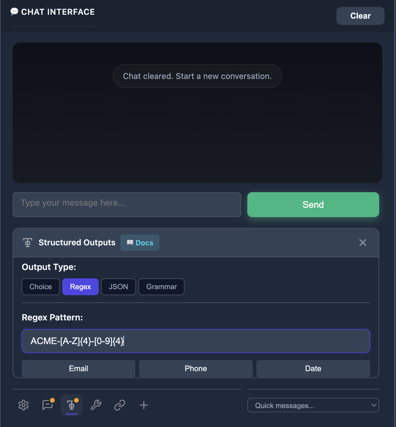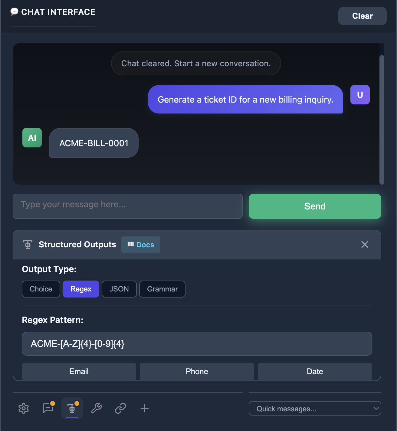 In practice, these features can complement each other — you might use JSON Schema for API responses in one conversation and Regex for ID generation in another. Choose the right constraint for each use case.