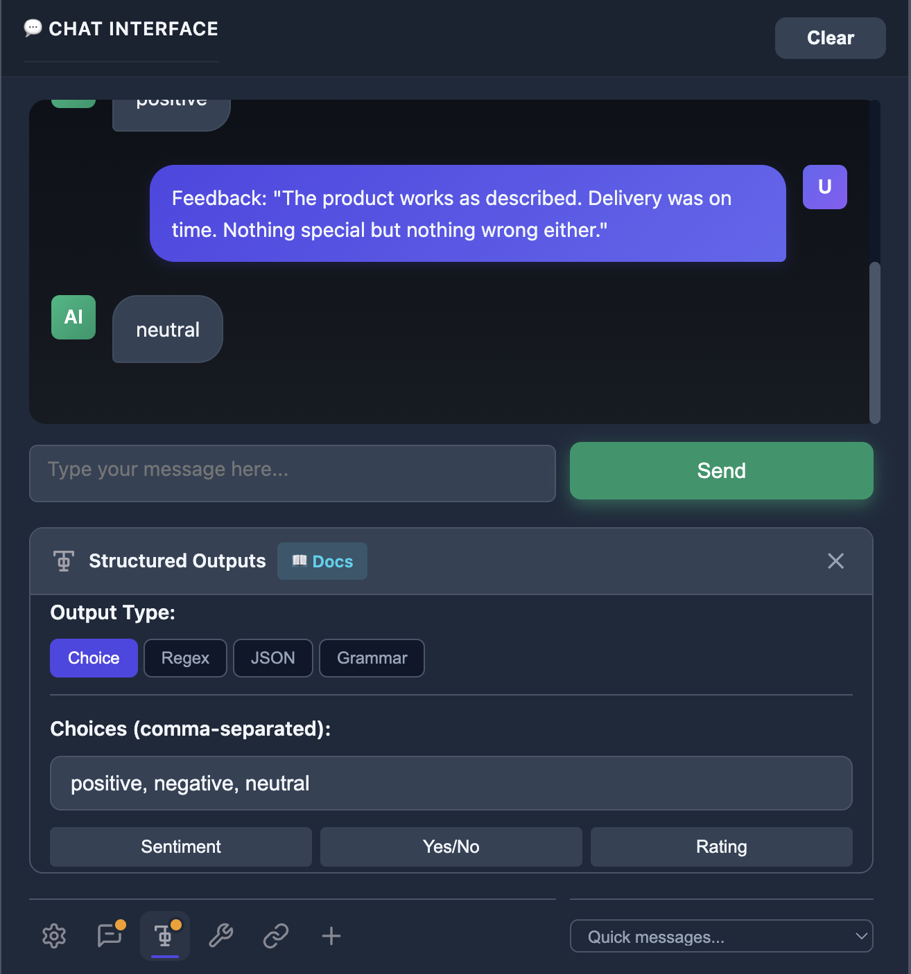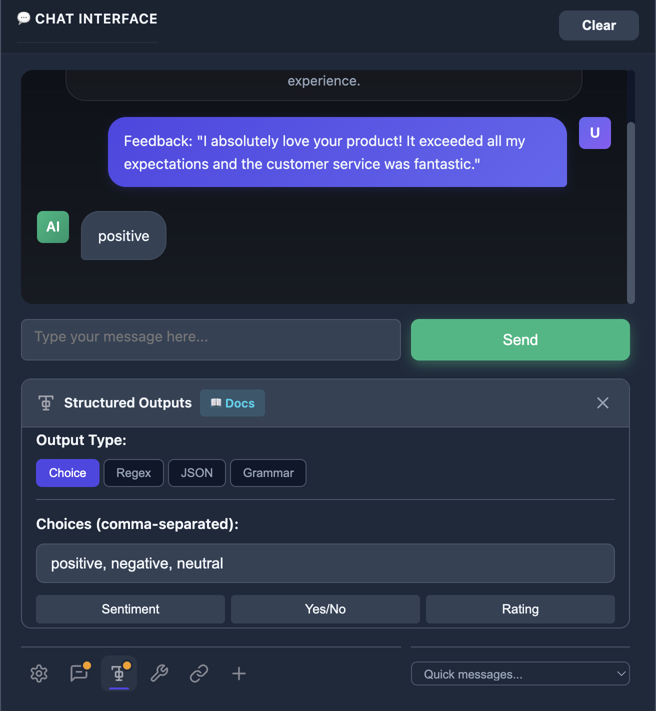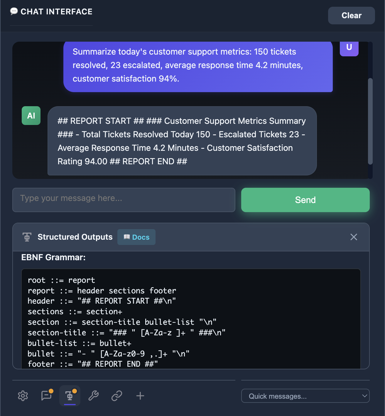 In practice, these features can complement each other — you might use JSON Schema for API responses in one conversation and Regex for ID generation in another. Choose the right constraint for each use case.