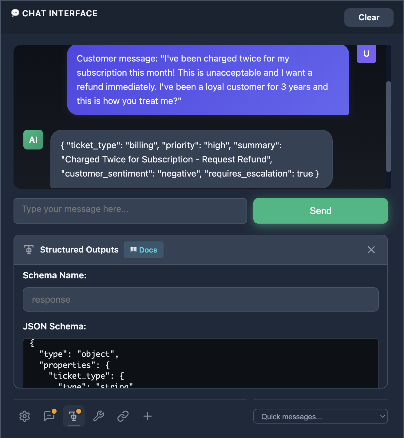 ACME's backend systems expect customer support responses in a specific JSON format. The AI must generate responses that conform exactly to the required schema, enabling direct API integration without post-processing.